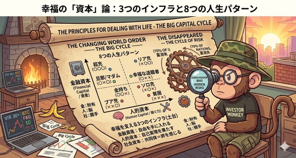 今回はこの本の内容をベースに、幸福な人生を築くための「3つの資本(インフラ)」と、残酷な「8つの人生パターン」、そして最強の「最適ポートフォリオ」について、徹底的に深掘りして解説していきます!
